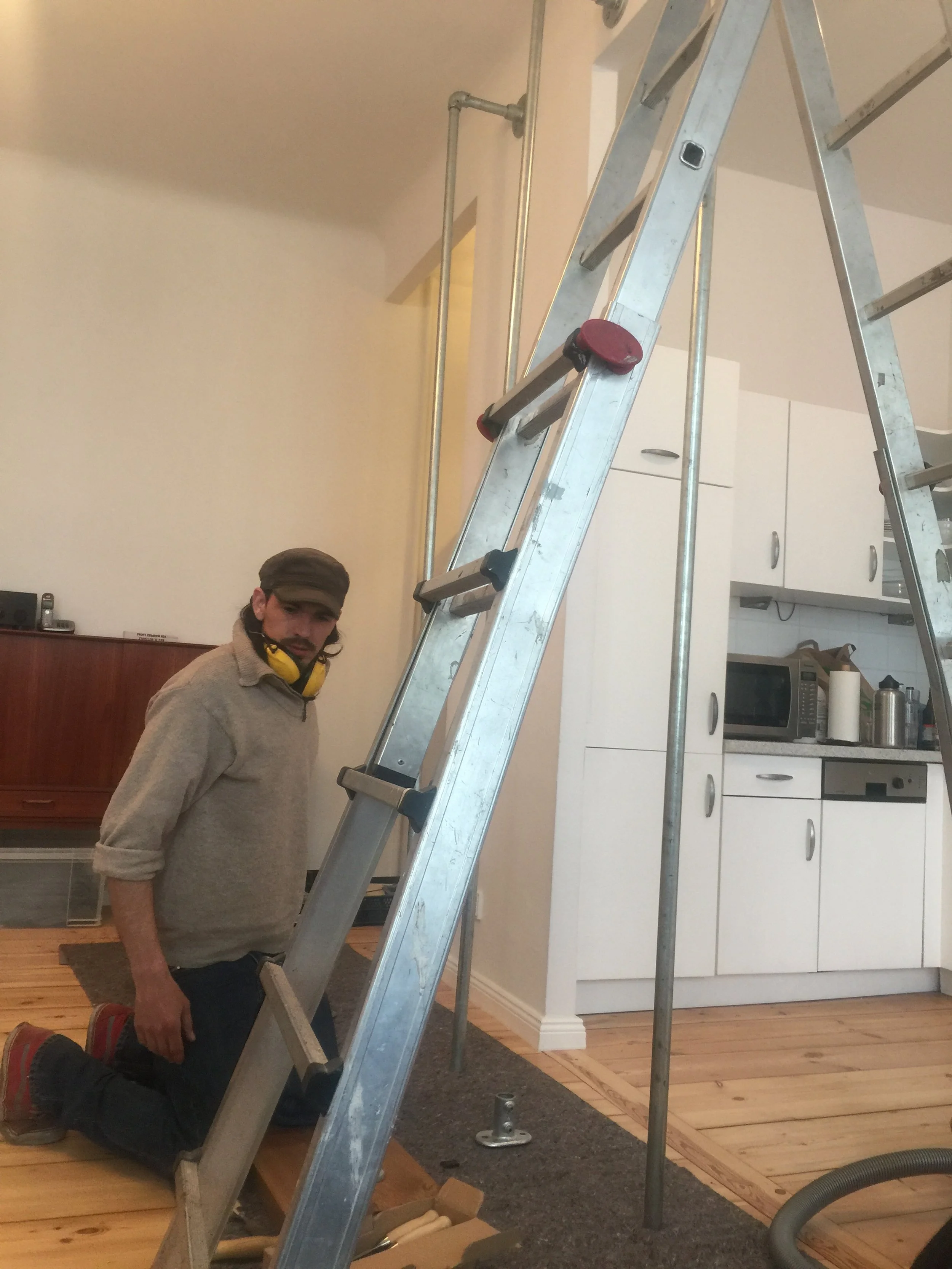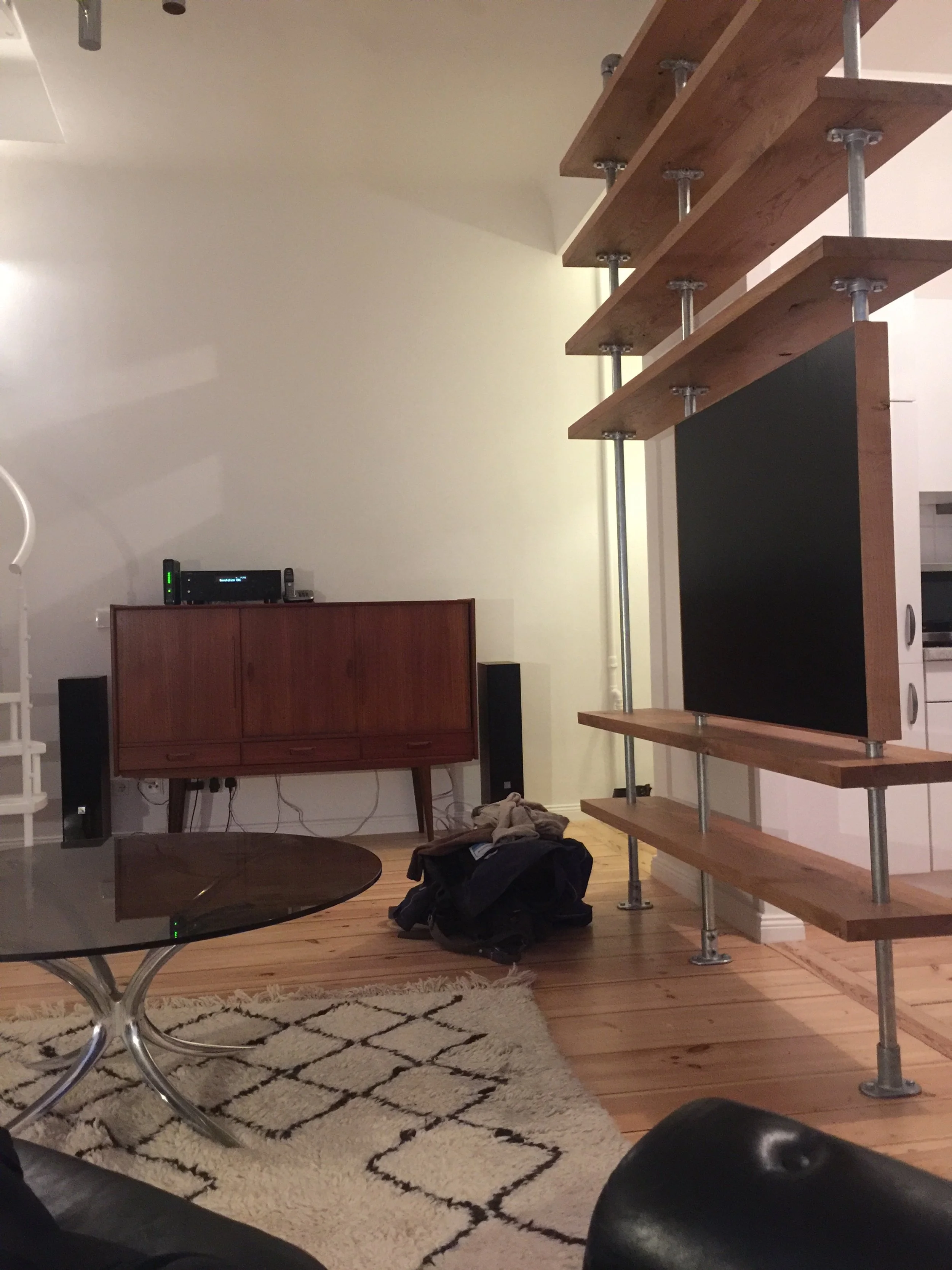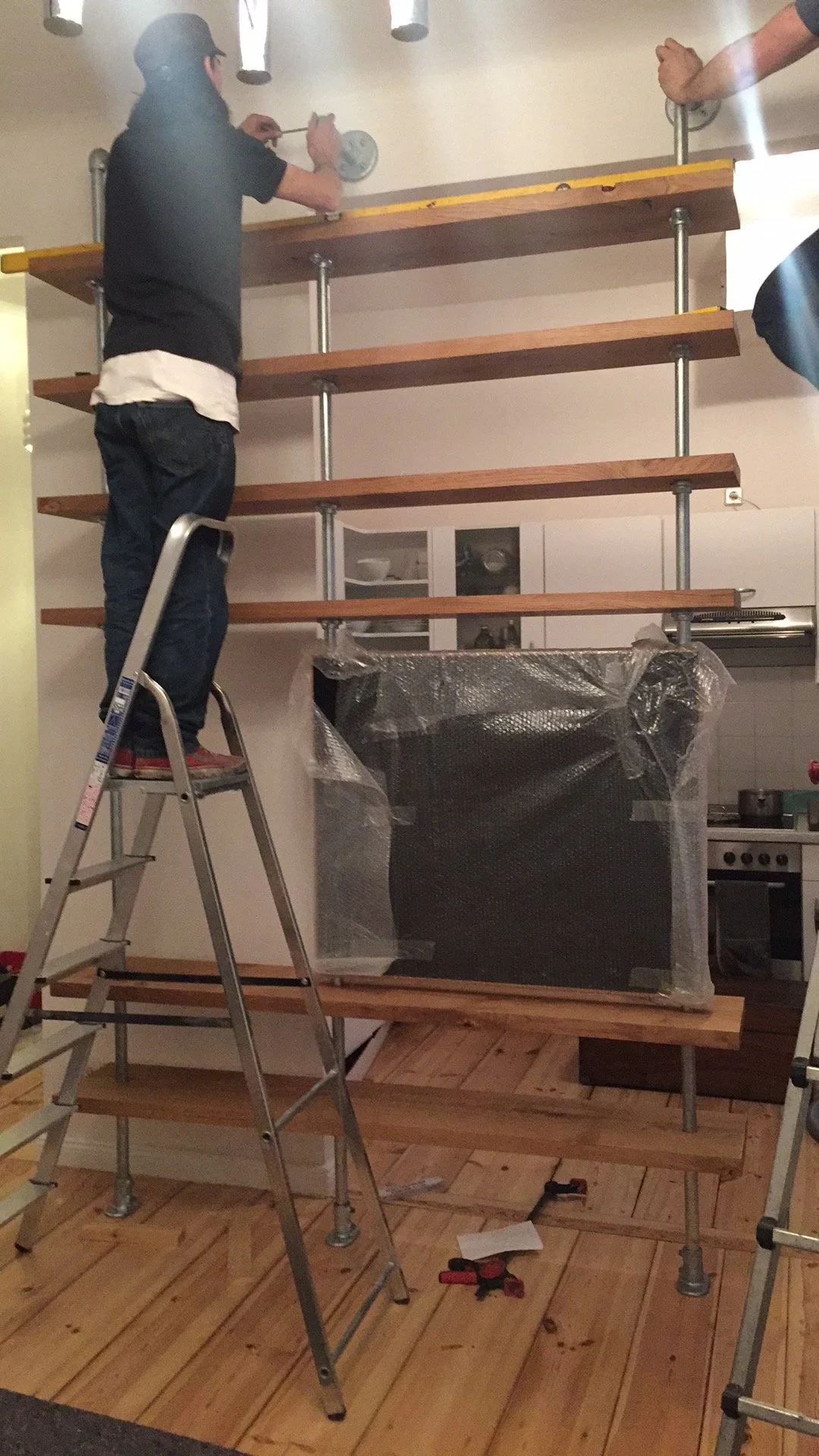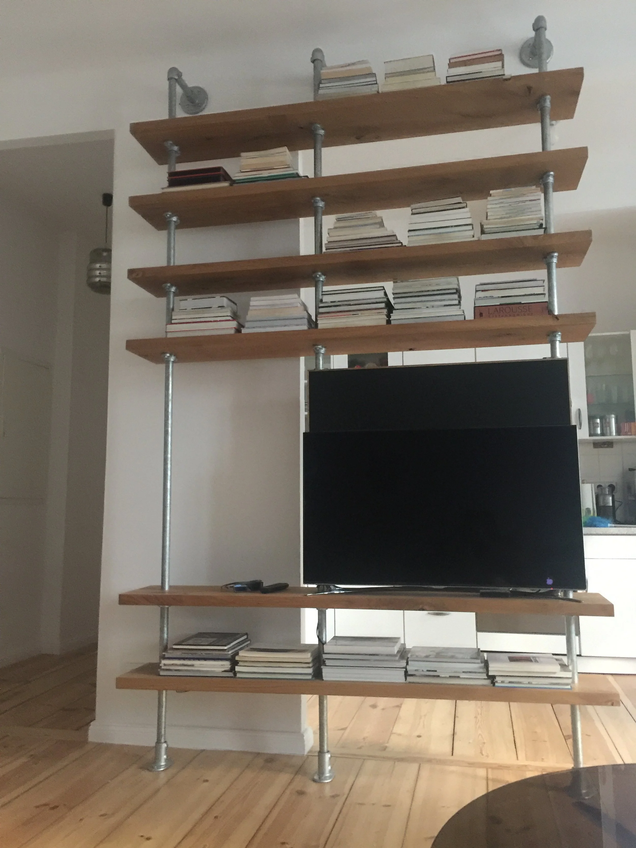 Sometimes, as with this Berlin project, after presenting designs and following up with the carpenter, I was also onsite for the installation and completion of the project, with this piece acting as a TV unit, room divider, and display bookcase with an industrial look.